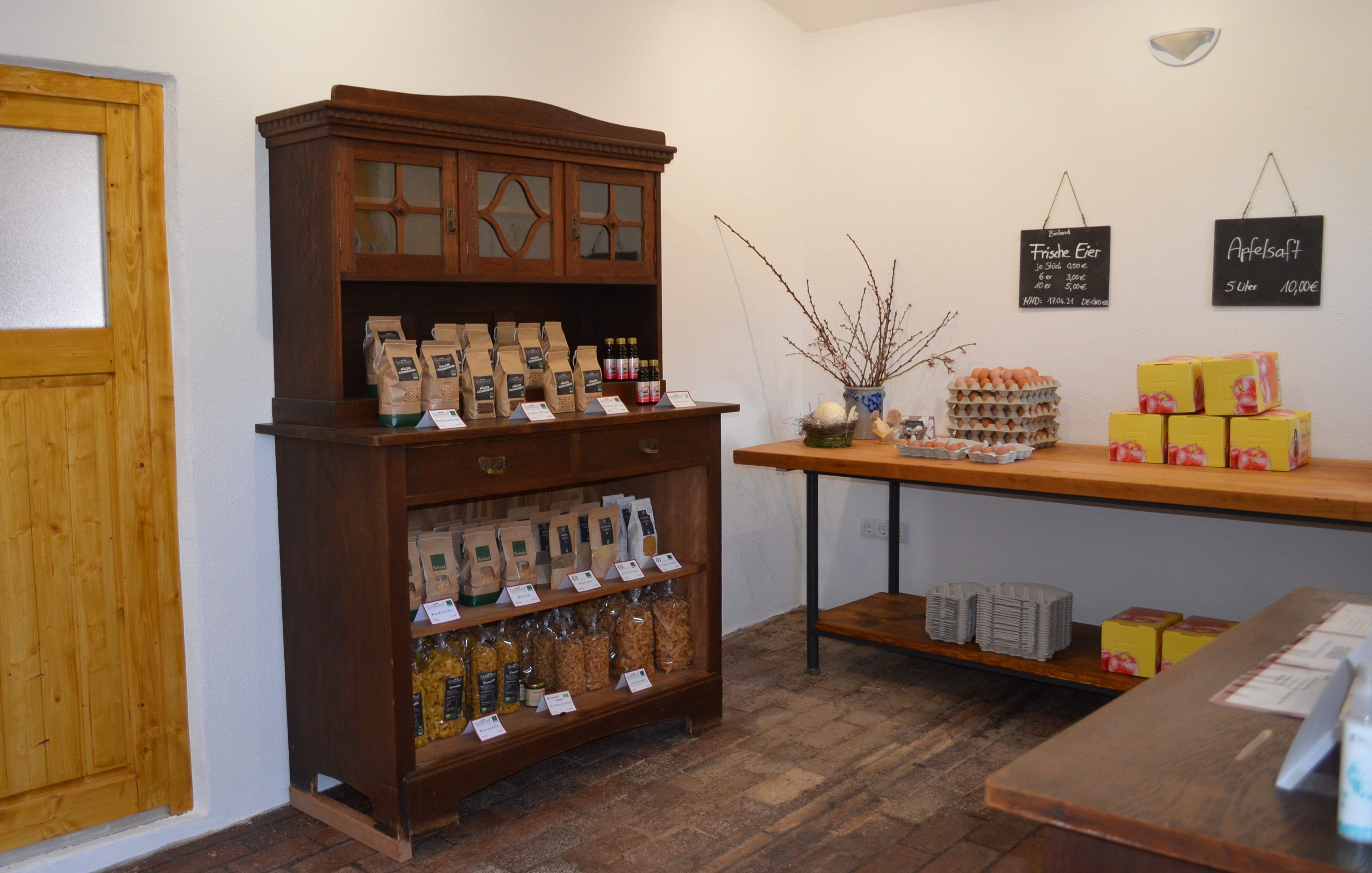 Seit dem 1. April 2021 kann man bei uns am Hof in unserem kleinen Selbstbedienungs-Hofladen einkaufen. Neben unseren eigen Produkten wie Eiern, Kartoffeln, Kichererbsen, Hirse, Nudeln, Apfelsaft und verschiedenen Getreidesorten lassen sich auch andere Produkte von regionalen und befreundeten Biobetrieben finden. Zum Beispiel gibt es Salat vom Weierhöfer Gartengemüse, Milchprodukte vom Hahnerhof aus Enkenbach-Alsenborn und Backwaren von der Mobilen Holzofenbäckerin aus Bennhausen.
