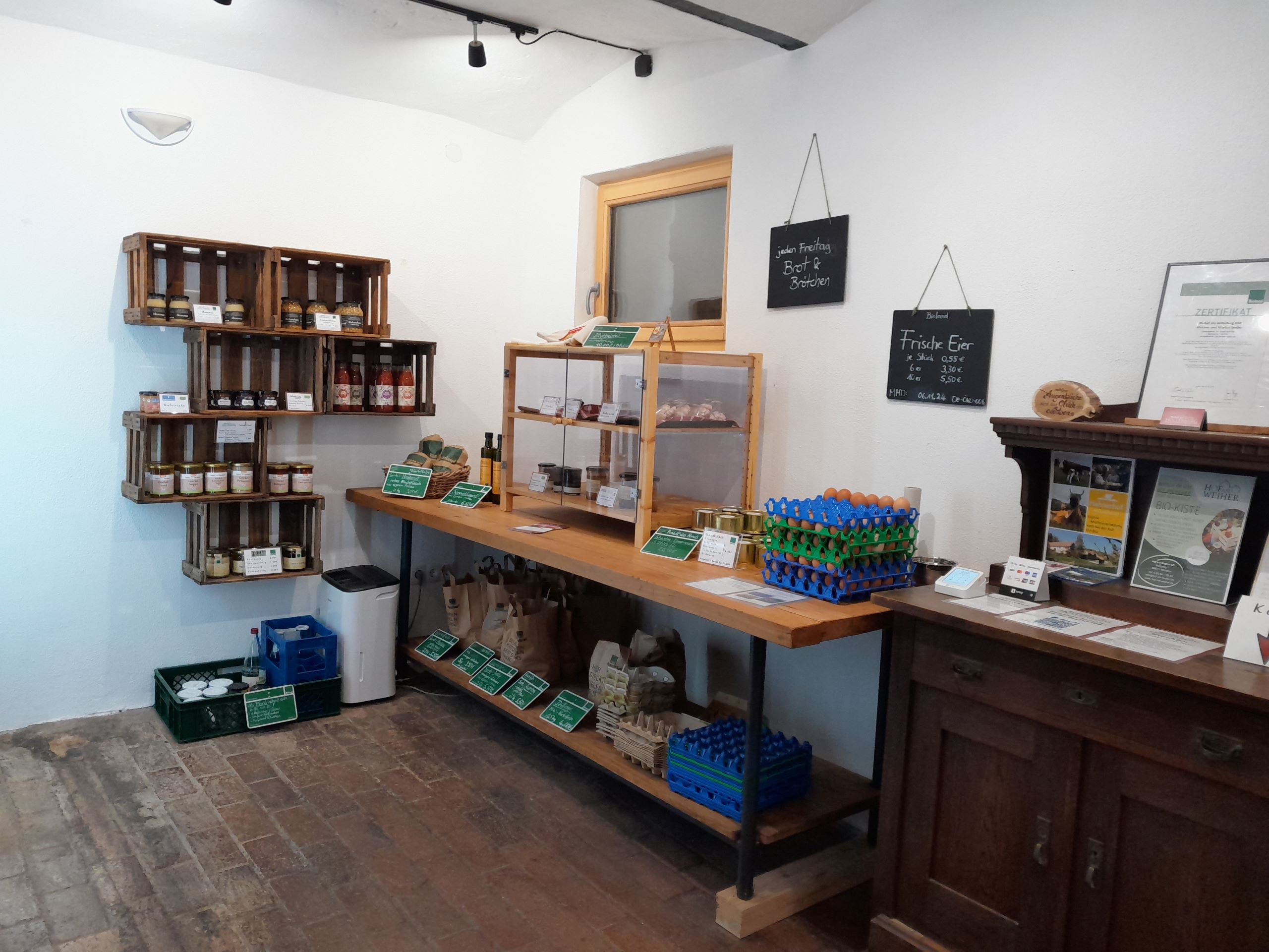 Seit dem 1. April 2021 kann man bei uns am Hof in unserem kleinen Selbstbedienungs-Hofladen einkaufen. Neben unseren eigen Produkten wie Eiern, Kartoffeln, Kichererbsen, Hirse, Nudeln, Apfelsaft und verschiedenen Getreidesorten lassen sich auch andere Produkte von regionalen und befreundeten Biobetrieben finden. Zum Beispiel gibt es Salat vom Weierhöfer Gartengemüse, Milchprodukte vom Hahnerhof aus Enkenbach-Alsenborn und Backwaren von der Mobilen Holzofenbäckerin aus Bennhausen.